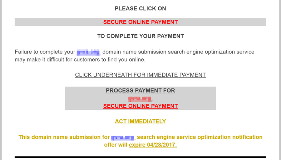 This Domain SEO Service Expiration Notice is a very clever and cynical scam. It deliberately creates a sense of apparent urgency around the renewal of a service and hopes that the recipient either is in too much of a hurry to read it or not knowledgeable enough to know that it is unnecessary. The originators know that in many small and medium sized businesses, the staff are working flat out and spending 5 – 10 minutes trying to work out whether something is genuine, is time they simply do not have.